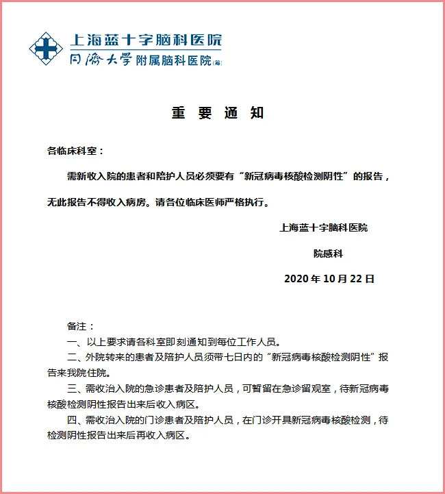 ▲ 10月22日公布的關(guān)于收入院患者及陪護(hù)人員須核酸檢測的重要通知