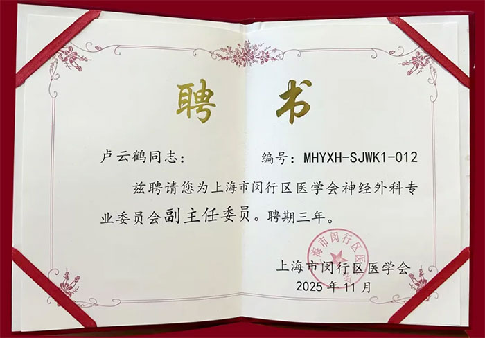 ▲ 盧云鶴博士獲聘上海市閔行區(qū)醫(yī)學會神經外科專業(yè)委員會副主任委員