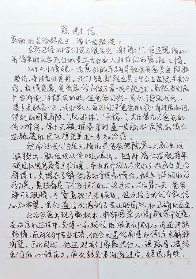 患者腦外傷嚴(yán)重,多次面臨生命的危險(xiǎn),但每一次患者都在醫(yī)護(hù)團(tuán)隊(duì)專(zhuān)業(yè)治療與精心護(hù)理下轉(zhuǎn)危為安,患者及其家屬因此非常感動(dòng),尤其是患者女兒,她親歷了父親治療的整個(gè)過(guò)程。為了表示感謝,患者女兒給6B病區(qū)醫(yī)護(hù)團(tuán)隊(duì)送來(lái)了兩面錦旗,而這次顱骨修補(bǔ)手術(shù)后,她更是寫(xiě)了兩頁(yè)滿(mǎn)滿(mǎn)的感謝信,每一字、每一句、每一段,訴說(shuō)這感動(dòng)與真情。(現(xiàn)附感謝信原文)感謝信