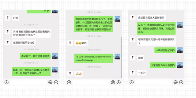 隨后,爸爸又出現(xiàn)了腦積水、肺部感染加重等并發(fā)癥。在治療的過(guò)程中,吳博士一如既往地跟我們耐心溝通、講解病情,面對(duì)各種專(zhuān)業(yè)術(shù)語(yǔ),他會(huì)用通俗易懂的例子來(lái)解釋清楚;與此同時(shí),他還會(huì)對(duì)我們家屬進(jìn)行心理疏導(dǎo),減輕我們的心理壓力,每次跟吳博士溝通過(guò)后,我的疑慮就會(huì)消除,整個(gè)內(nèi)心也隨之明亮起來(lái),充滿(mǎn)了希望!入院后三個(gè)月的日日夜夜中,在吳博士的精湛醫(yī)術(shù)和潘仁龍教授帶領(lǐng)的專(zhuān)業(yè)團(tuán)隊(duì)的精心服務(wù)和不懈努力下,爸爸的病情一天天的好轉(zhuǎn)起來(lái),慢慢的恢復(fù)了意識(shí),病發(fā)癥也得到了有效的控制,并接受了全方位的康復(fù)治療,7月底爸爸出院回老家康復(fù)了。