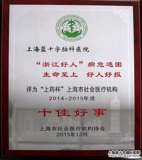 2015年12月19日,上海市社會(huì)醫(yī)療機(jī)構(gòu)協(xié)會(huì)二屆二次會(huì)員代表大會(huì)暨第五屆管理年會(huì)在上海交通大學(xué)醫(yī)學(xué)院懿德樓會(huì)議廳隆重召開(kāi)。會(huì)上,上海藍(lán)十字腦科醫(yī)院“‘浙江好人’病危遇困生命至上好人好報(bào)”榮獲“上藥杯”上海市社會(huì)醫(yī)療機(jī)構(gòu)2014--2015年度“十佳好事”稱(chēng)號(hào)。