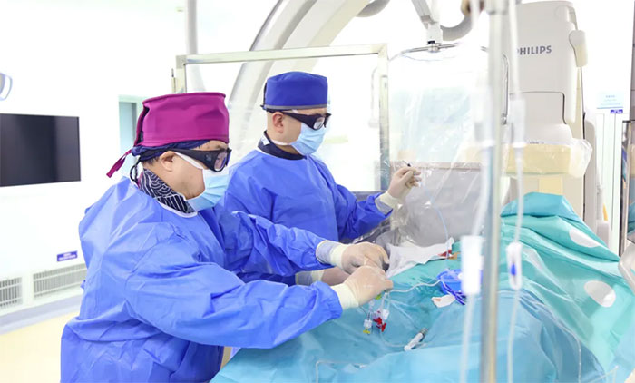 ▲ 席剛明教授、王貴平博士在進(jìn)行下肢動脈硬化閉塞癥血管開通及支架置入術(shù)