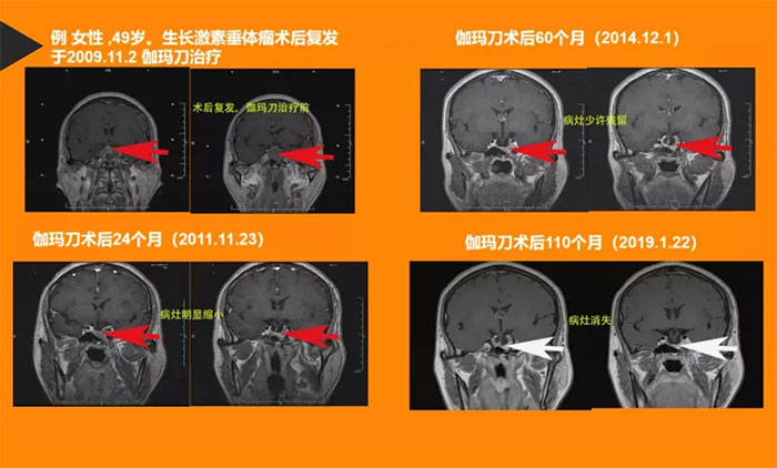 一項(xiàng)單中心單次伽瑪?shù)禨RS治療垂體生長激素腺瘤的回顧性研究顯示,57%(58/102)的肢大患者在中位時間19個月內(nèi)達(dá)到生化緩解。黃潤生副主任曾長期追蹤一位垂體生長激素腺瘤術(shù)后殘留再行伽瑪?shù)吨委熀蠡颊叩牟∏樽兓?/p>