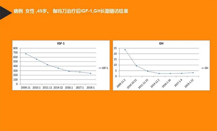 ▲經(jīng)伽瑪?shù)吨委,患者GH值和IGF-1值逐漸下降到正常范圍