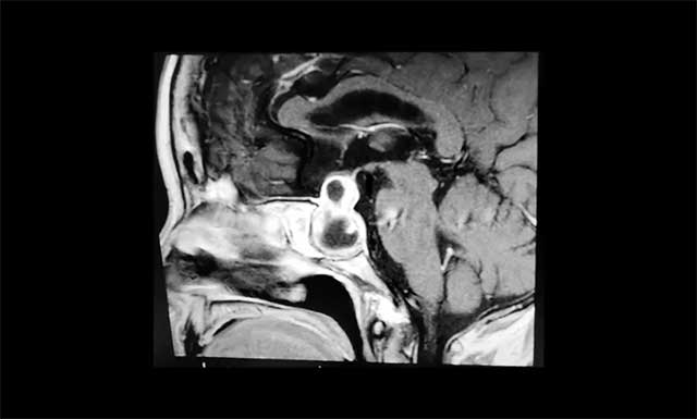 李士其教授分析:腫瘤主體位于鞍內(nèi)、鞍上、鞍旁發(fā)展,呈“啞鈴”形。從影像學(xué)資料上看,發(fā)現(xiàn)瘤體已經(jīng)非常大了,屬于巨大垂體瘤。瘤體占據(jù)鞍區(qū),并向蝶竇和鞍上發(fā)展,侵襲雙側(cè)海綿竇,視神經(jīng)、視交叉受壓,所以需要馬上進行手術(shù)切除,解除壓迫。若任其發(fā)展,將來有失明的風(fēng)險。
