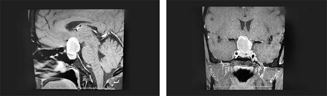 頭顱鞍區(qū)MRI平掃+增強顯示:鞍區(qū)見團塊狀異常信號影,大小約2.6*2.1*2.5cm。瘤灶向上突入鞍上池、第三腦室受壓,鞍隔受壓下塌,垂體上緣受壓變扁。鞍底骨質(zhì)略下陷,視交叉上抬、分界不清。