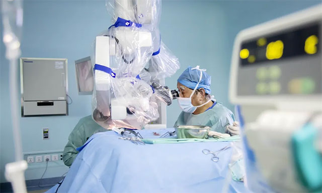 借助蔡司顯微鏡(雙熒光),沈建康教授仔細(xì)探查患者面神經(jīng)顱內(nèi)段Ⅰ~Ⅳ區(qū),見椎基底動脈、小腦前下動脈與左側(cè)面神經(jīng)神經(jīng)出腦干起始處接觸密切。沈教授小心翼翼地將面神經(jīng)與責(zé)任血管分離,并填入特殊材質(zhì)的墊片。整臺手術(shù)歷時三個多小時,順利完成。