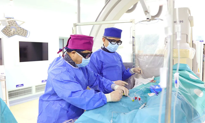 ▲ 4A腦血管病一科主任席剛明教授、4A腦血管病一科副主任王貴平博士在為患者手術(shù)