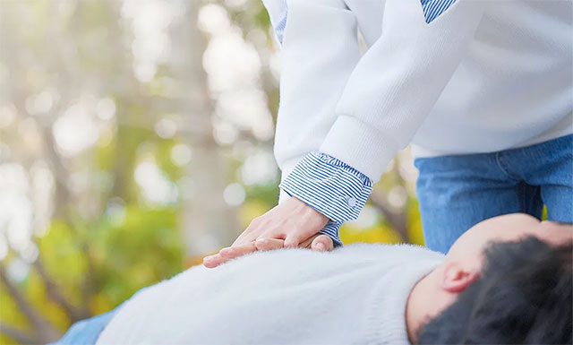 如果跌倒者意識不清楚,就需要觀察是否有呼吸,方法是看胸部是否有起伏。沒有呼吸,應(yīng)馬上使其平躺,用掌根在其胸部正中(兩乳頭連線中點)連續(xù)快速用力按壓,并讓周圍的人立即打120求助。