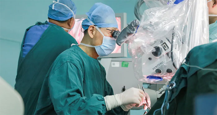 ▲侯增欣主任通過蔡司顯微鏡(雙熒光)為患者手術(shù)