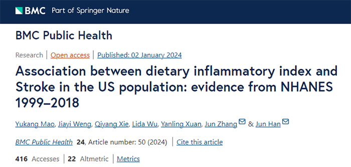 腦卒中,俗稱“中風(fēng)”,是導(dǎo)致我國居民死亡和殘疾的第一大原因。最新發(fā)表于《英國醫(yī)學(xué)會(huì)公共衛(wèi)生》期刊的學(xué)術(shù)研究《Association between dietary inflammatory index and Stroke in the Us population: evidence from NHANES 1999-2018》指出,由飲食導(dǎo)致的相關(guān)炎癥會(huì)增加中風(fēng)風(fēng)險(xiǎn)。