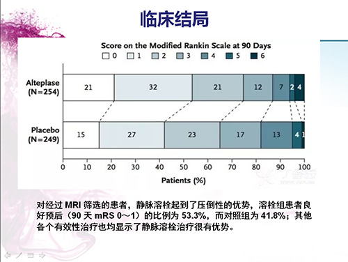 張靜波主任介紹,醒后卒中患者一般不能接受靜脈溶栓治療,只有部分患者可以接受機械取栓術(shù)。而事實上,在醒后卒中患者中,有相當部分可能都發(fā)生在覺醒前數(shù)小時,并且在靜脈溶栓批準的時間窗內(nèi)。因此,即使“時間窗”超過4.5小時,基于嚴格的影像學篩查,來篩選出適合靜脈溶栓的腦;颊,對這類人群意義重大,為患者帶來了新希望。