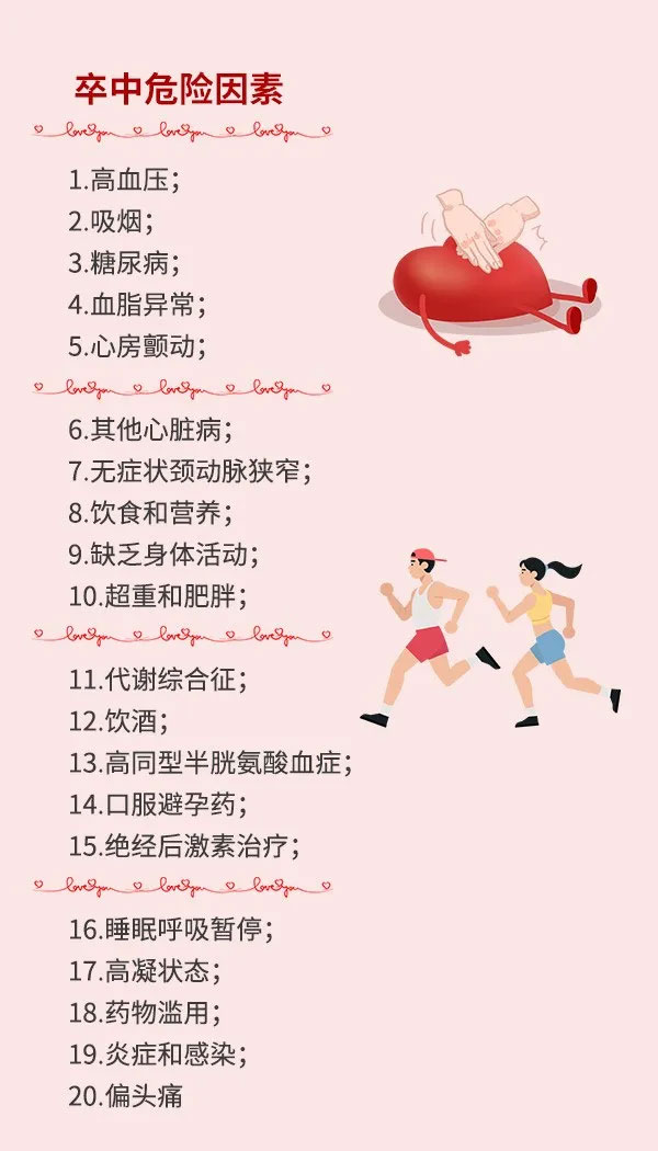 可以看出,在 “三級(jí)預(yù)防” 體系中,一級(jí)預(yù)防至關(guān)重要。除了年齡、性別等少數(shù)幾項(xiàng)不可控危險(xiǎn)因素外,在最新出爐的《中國(guó)腦血管病一級(jí)預(yù)防指南2019》中,明確列出了多達(dá)20項(xiàng)可干預(yù)的卒中危險(xiǎn)因素,包括: