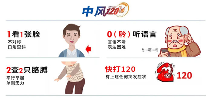 要快速判別卒中與否,有簡(jiǎn)單形象的方法,那就是牢記“中風(fēng)120”: