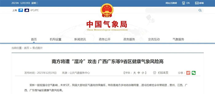 中國氣象局公共氣象服務(wù)中心12月19日發(fā)布健康氣象風(fēng)險預(yù)報,受新一股較強(qiáng)冷空氣影響,未來5天,我國大部地區(qū)氣溫將持續(xù)偏低,特別是南方多地將伴隨雨雪,濕冷的感覺會非常明顯。