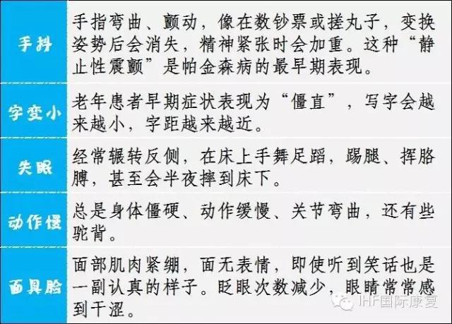 特發(fā)性震顫只有抖動(dòng)這一個(gè)癥狀,而且不是一直在抖,是在做動(dòng)作(比如端杯子,伸筷子夾菜)的時(shí)候才會(huì)抖,越是緊張激動(dòng)的時(shí)候越明顯,安靜不動(dòng)的時(shí)候不會(huì)抖,并且少量飲酒可減輕抖動(dòng)。帕金森病人除了手抖之外,還有許多其他的癥狀。如上圖所述的動(dòng)作遲緩、面具臉、抑郁等等。而且帕金森病人的抖是在安靜的時(shí)候較明顯,做動(dòng)作的時(shí)候反而不明顯。