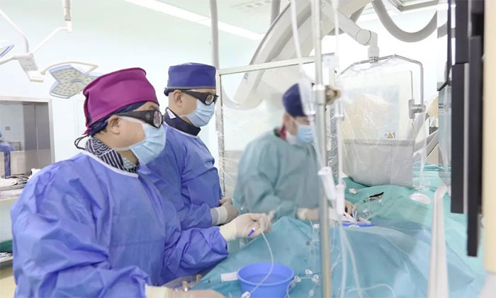 ▲ 神經(jīng)內(nèi)科4A病區(qū)主任席剛明教授、副主任王貴平博士在開展腦動脈瘤介入手術(shù)