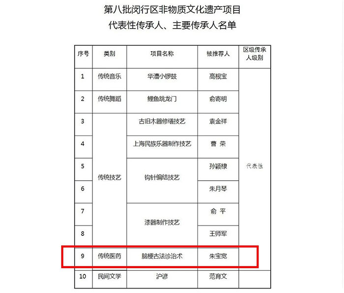 近日,上海市閔行區(qū)人民政府公布了閔行區(qū)第十批非物質(zhì)文化遺產(chǎn)代表性項(xiàng)目名錄(共計(jì)4項(xiàng))和第八批非物質(zhì)文化遺產(chǎn)項(xiàng)目代表性傳承人、主要傳承人名單(共計(jì)20名)。上海藍(lán)十字腦科醫(yī)院雙喜臨門,“腦梗古法診治術(shù)”入選閔行區(qū)第十批非物質(zhì)文化遺產(chǎn)代表性項(xiàng)目名錄,中醫(yī)科專家朱寶寬入選第八批非物質(zhì)文化遺產(chǎn)項(xiàng)目代表性傳承人、主要傳承人名單。