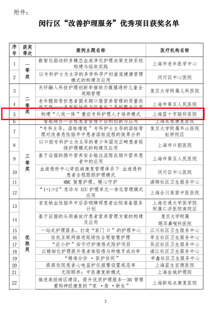 為深入推進(jìn)醫(yī)療衛(wèi)生高質(zhì)量發(fā)展,切實(shí)解決群眾就醫(yī)過程中的急難愁盼問題,閔行區(qū)開展“改善護(hù)理服務(wù)”優(yōu)秀項(xiàng)目評(píng)選,聚焦護(hù)理服務(wù)品質(zhì)提升,優(yōu)化護(hù)理服務(wù)模式,讓優(yōu)質(zhì)護(hù)理更加貼近患者需求。經(jīng)綜合評(píng)估和專家評(píng)審,醫(yī)院《構(gòu)建“八線一體”重癥專科護(hù)理人才培養(yǎng)模式》項(xiàng)目最終獲得二等獎(jiǎng)。
