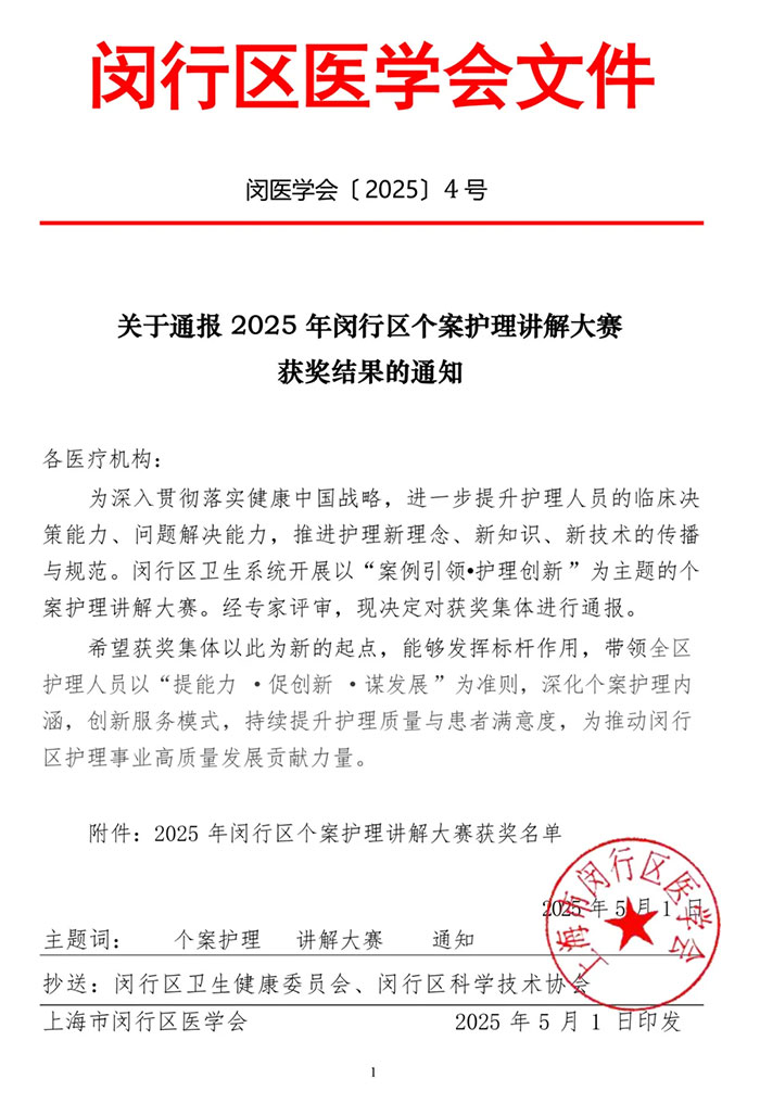 為深入貫徹落實(shí)健康中國(guó)戰(zhàn)略,進(jìn)一步提升護(hù)理人員的臨床決策能力、問題解決能力,推進(jìn)護(hù)理新理念、新知識(shí)、新技術(shù)的傳播與規(guī)范。閔行區(qū)衛(wèi)生系統(tǒng)開展以“案例引領(lǐng)•護(hù)理創(chuàng)新”為主題的個(gè)案護(hù)理講解大賽。經(jīng)專家評(píng)審,醫(yī)院提交的《1例導(dǎo)管部分?jǐn)嗔延跋駥W(xué)識(shí)別與干預(yù)案例分享》憑借創(chuàng)新的護(hù)理模式、科學(xué)的干預(yù)路徑及良好的臨床效果,從全區(qū)53個(gè)案例中脫穎而出。