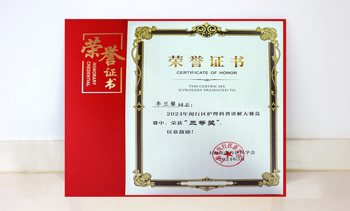 《動起來,不要被“栓”住》凝聚了醫(yī)院護(hù)理團(tuán)隊的智慧和努力,以預(yù)防“血栓”疾病為主題,以“深靜脈血栓(DVT)”真實事例為切入點,通過視頻和現(xiàn)場講解相結(jié)合的方式,展示了血栓的病因、危害、形成和預(yù)防常識,多角度地將深奧的專業(yè)醫(yī)學(xué)知識進(jìn)行生動鮮活的演繹。憑借精妙的創(chuàng)意及李蘭馨護(hù)士長現(xiàn)場出色的演講,讓觀眾及評委產(chǎn)生了強(qiáng)烈的代入感和認(rèn)同感,在53個作品中脫穎而出,獲得“2024 年閔行區(qū)護(hù)理科普講解大賽”三等獎的佳績。