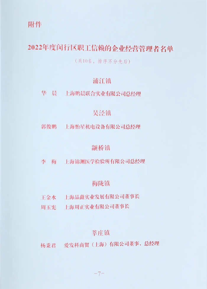 2023年,在閔行區(qū)創(chuàng)建勞動關(guān)系和諧企業(yè)(廠務(wù)公開)領(lǐng)導小組于全區(qū)范圍內(nèi)開展的2022年“閔行區(qū)職工信賴的企業(yè)經(jīng)營管理者”評選中,上海藍十字腦科醫(yī)院【同濟大學附屬上海藍十字腦科醫(yī)院(籌)】書記朱敏憑借在推動和諧勞動關(guān)系企業(yè)創(chuàng)建中的突出成績,榮獲“2022年度閔行區(qū)職工信賴的企業(yè)經(jīng)營管理者”稱號。