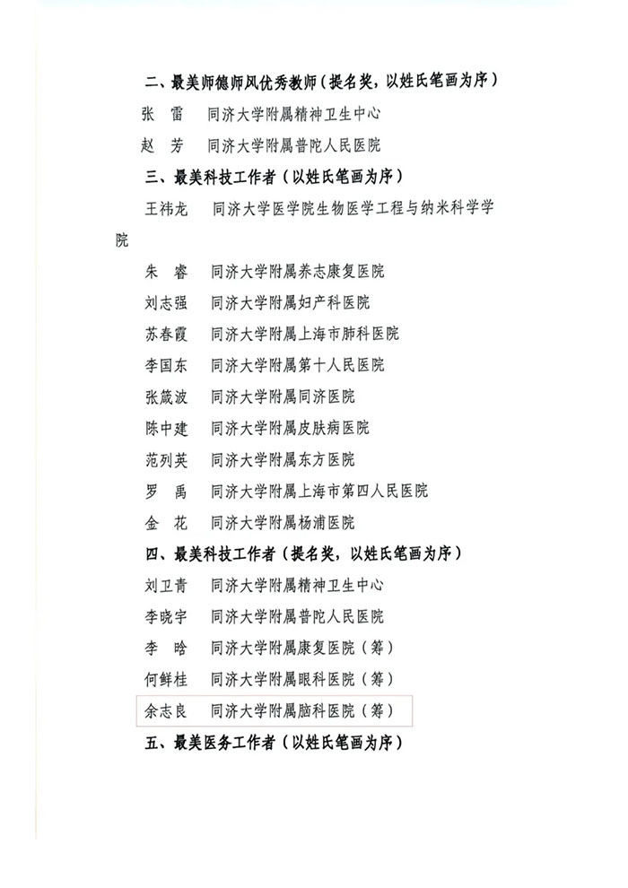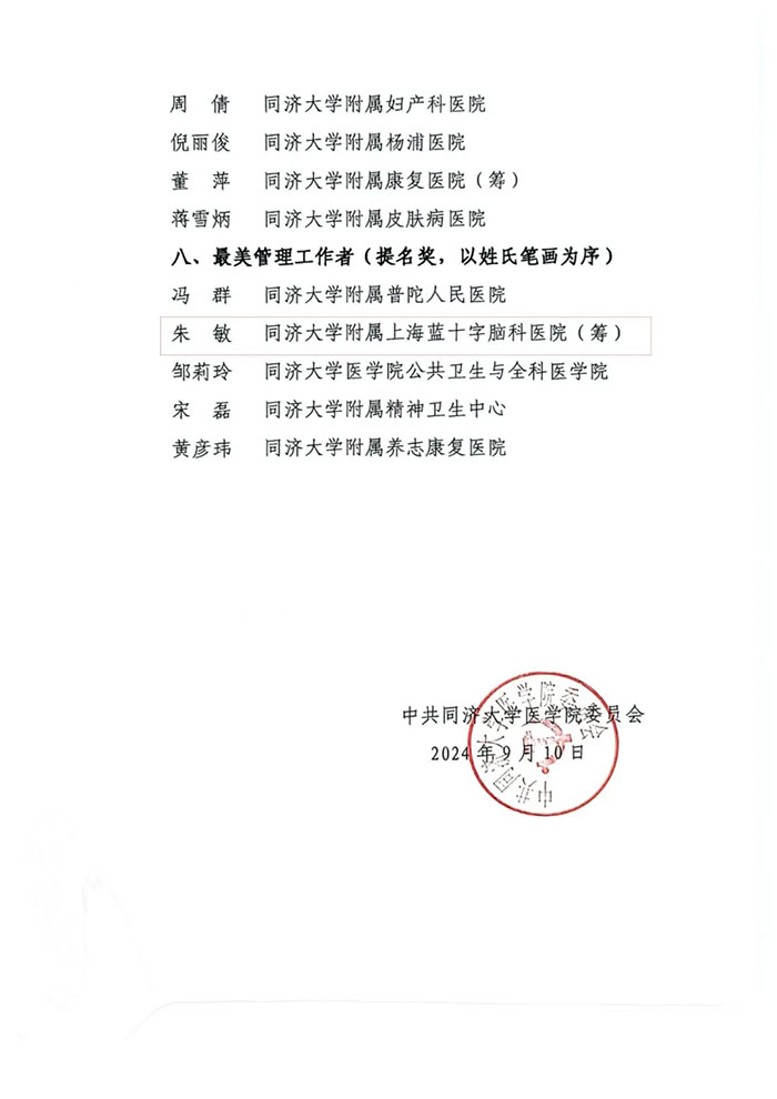 近日,中共同濟(jì)大學(xué)醫(yī)學(xué)院委員會(huì)開展的2024年度“同醫(yī)最美人物”評選結(jié)果揭曉。2024年度“同醫(yī)最美人物”評選工作經(jīng)中共同濟(jì)大學(xué)醫(yī)學(xué)院委員會(huì)審議決定,在各院系、中心及附屬醫(yī)院中產(chǎn)生“最美師德師風(fēng)優(yōu)秀教師”10名、提名獎(jiǎng)2名,“最美科技工作者”10名、提名獎(jiǎng)5名,“最美醫(yī)務(wù)工作者”10名、提名獎(jiǎng)5名,“最美管理工作者”10名、提名獎(jiǎng)4名。