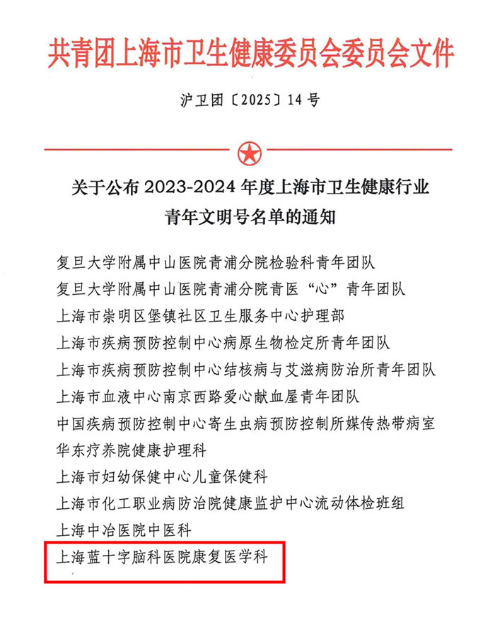 2023年6月,康復(fù)醫(yī)學(xué)科在醫(yī)院黨支部的統(tǒng)籌引領(lǐng)與大力推薦下,憑借扎實的專業(yè)基礎(chǔ)、積極向上的團隊風(fēng)貌以及良好的發(fā)展?jié)摿,順利通過資格審核,成功入選“2023-2024年度上海市衛(wèi)生健康行業(yè)青年文明號”創(chuàng)建名單。2025年9月成功入選全市80家典型集體之一。