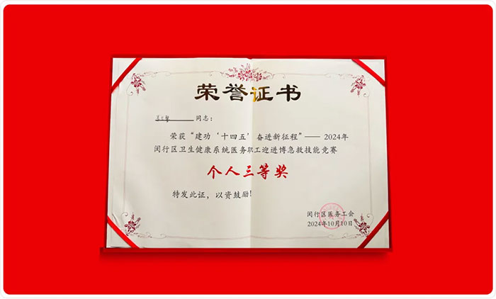 在比賽中,選手們爭分奪秒、全力以赴,現(xiàn)場氣氛緊張而熱烈。在模擬的真實急救場景下,參賽選手們啟動急救程序,并準確無誤地完成一系列復雜的救治動作。面對實力強勁的競爭對手,上海藍十字腦科醫(yī)院參賽隊的選手們無懼壓力、沉著冷靜、有條不紊、全情投入、通力協(xié)作,充分展示了應(yīng)急救護的規(guī)范操作流程。經(jīng)過激烈角逐,最終,上海藍十字腦科醫(yī)院參賽隊榮獲團體及個人三等獎。這不僅是對他們專業(yè)技能的一次全面檢閱,更是對心理素質(zhì)和團隊協(xié)作能力的極大考驗。