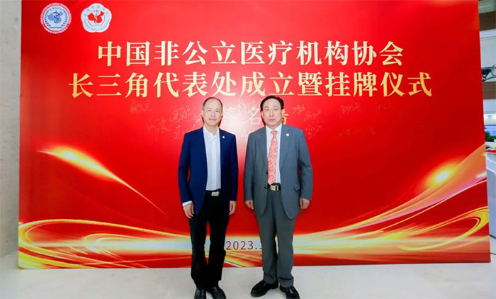 ▲ 中國非公立醫(yī)療機(jī)構(gòu)協(xié)會郝德明副會長與項(xiàng)耀鈞院長合影