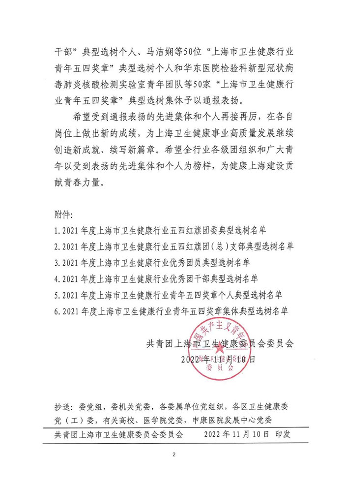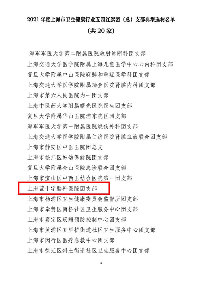 11月10日,市衛(wèi)生健康委團(tuán)委通報(bào)表?yè)P(yáng)2021年度上海市衛(wèi)生健康行業(yè)五四紅旗團(tuán)組織、優(yōu)秀團(tuán)員、優(yōu)秀團(tuán)干部、青年五四獎(jiǎng)?wù)碌湫瓦x樹個(gè)人和集體。上海藍(lán)十字腦科醫(yī)院團(tuán)支部榮獲“2021年度上海市衛(wèi)生健康行業(yè)五四紅旗團(tuán)(總)支部”稱號(hào)。