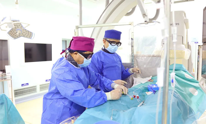 ▲ 4F腦血管病科主任席剛明教授、4A腦血管病一科副主任王貴平博士在開展介入手術(shù)