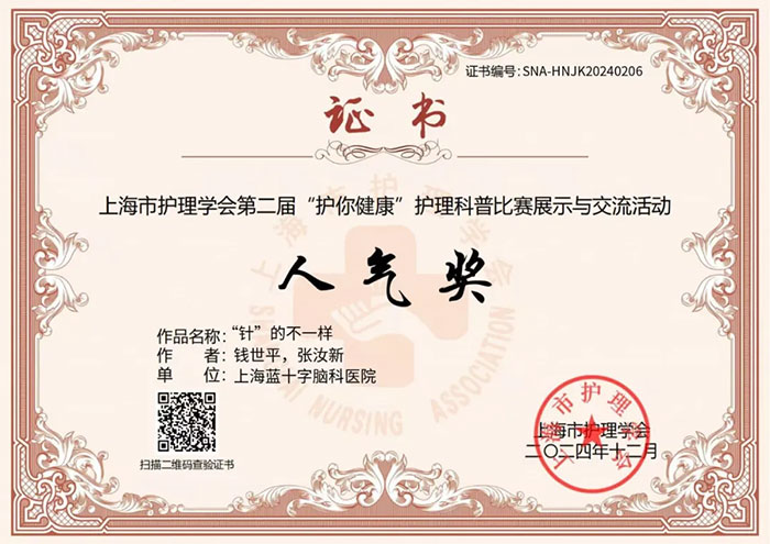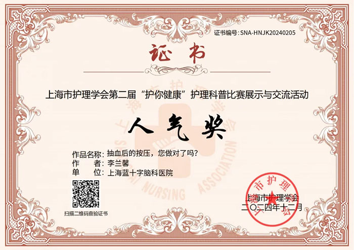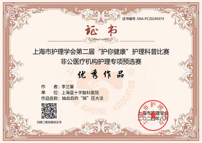 經(jīng)過激烈角逐,上海藍(lán)十字腦科醫(yī)院【同濟(jì)大學(xué)附屬上海藍(lán)十字腦科醫(yī)院(籌)】精心選送的參賽作品《抽血后的按壓,您做對了嗎?》(作者:李蘭馨)榮獲上海市護(hù)理學(xué)會(huì)第二屆“護(hù)你健康”護(hù)理科普比賽真人講解類(含脫口秀)三等獎(jiǎng)。