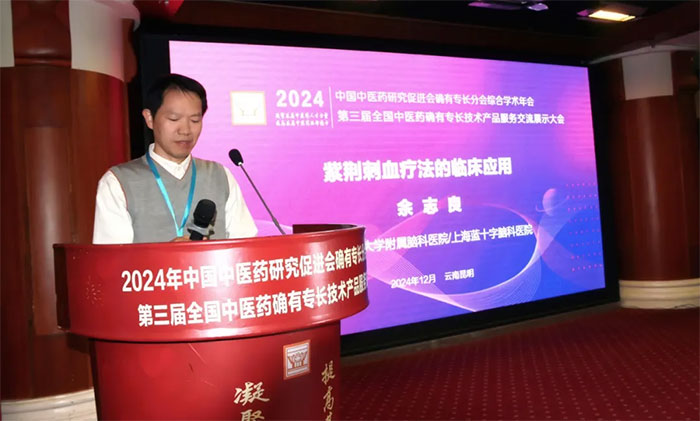上海藍(lán)十字腦科醫(yī)院5B病區(qū)主任余志良博士受邀參加此次大會,并以精研首創(chuàng)的“紫荊刺血療法的臨床應(yīng)用”為主題,上臺交流發(fā)言。