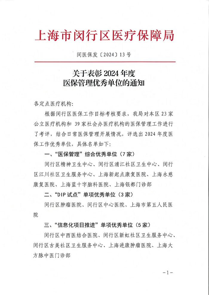 根據(jù)閔行區(qū)醫(yī)療保障局《關(guān)于表彰 2024年度醫(yī)保管理優(yōu)秀單位的通知》(閔醫(yī)保發(fā)【2024】13號),區(qū)醫(yī)保局根據(jù)醫(yī)保工作目標(biāo)考核要求,對閔行區(qū)23家公立醫(yī)療機構(gòu)和39家社會辦醫(yī)療機構(gòu)的醫(yī)保管理工作進(jìn)行了考評,結(jié)合日常醫(yī)保管理開展情況,最終評選出2024年度醫(yī)保工作優(yōu)秀單位。