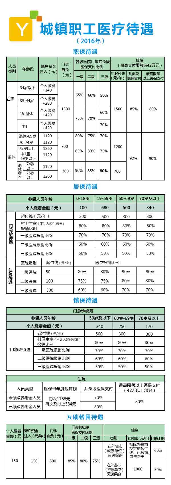 不同的參保險種有不同的醫(yī)保待遇,醫(yī)保管理部門會適時進(jìn)行調(diào)整,目前各類醫(yī)保待遇如下表: