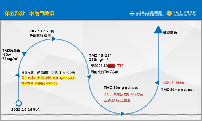 此次盧博士分享的病例主題為:?jiǎn)拘崖樽硐伦箢~語言區(qū)(Broca區(qū))膠質(zhì)瘤切除;颊邽橐幻夏昱,因反復(fù)頭暈乏力2月入院。病例中,患者經(jīng)歷了手術(shù)、綜合治療,直至復(fù)發(fā)后的節(jié)律化療。詳細(xì)展示了膠質(zhì)瘤治療全程管理的實(shí)施過程,包括術(shù)前準(zhǔn)備、術(shù)中導(dǎo)航、電生理監(jiān)測(cè)、術(shù)中喚醒、腫瘤切除、術(shù)后病理和分子檢測(cè)等關(guān)鍵步驟。強(qiáng)調(diào)了術(shù)前重建、術(shù)中電生理監(jiān)測(cè)和術(shù)后分子檢測(cè)的重要性,以及術(shù)后綜合治療和隨訪的必要性。