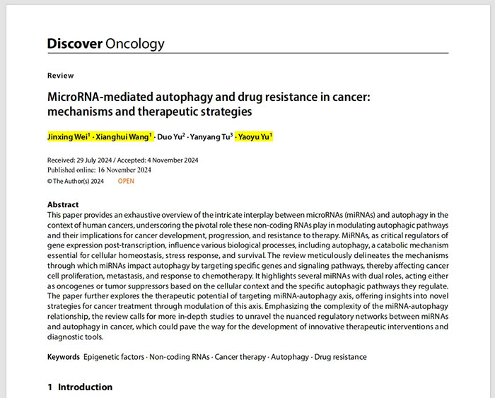 科研創(chuàng)新,捷報頻傳。近期,SCI還收錄了由神經(jīng)外科學(xué)術(shù)副院長兼6A神經(jīng)外一科主任于耀宇擔(dān)任通訊作者,6A神經(jīng)外一科魏金星醫(yī)生、王向輝醫(yī)生共同擔(dān)任第一作者在國際學(xué)術(shù)期刊《探索腫瘤學(xué)》(Discover Oncology)發(fā)表的題為“MicroRNAmediated autophagy and drug resistance in cancer:mechanisms and therapeutic strategies”(腫瘤中MicroRNA介導(dǎo)的自噬和耐藥:機制和治療策略)的學(xué)術(shù)論文被SCI收錄,影響因子2.8。