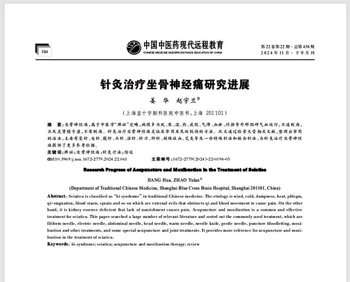 醫(yī)院一直鼓勵并支持各科室各部門開展科研工作,將豐富的臨床經(jīng)驗和醫(yī)學(xué)理論知識有機結(jié)合,加強科研創(chuàng)新,推動學(xué)科縱深發(fā)展。在上海藍十字腦科醫(yī)院,像任明博士、于耀宇主任這樣專注于臨床一線,又熱衷科研創(chuàng)新的醫(yī)生并非少數(shù)。近期,中醫(yī)科姜華醫(yī)生、趙宇蘭醫(yī)生在《中國中醫(yī)藥現(xiàn)代遠程教育》發(fā)表了學(xué)術(shù)論文《針灸治療坐骨神經(jīng)痛研究進展》。