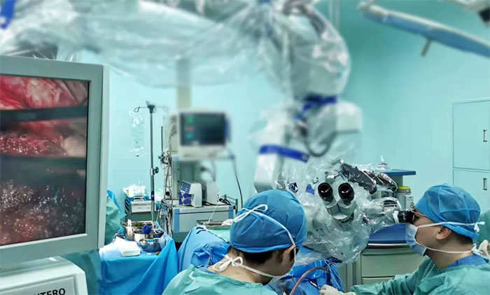 手術(shù)選擇右側(cè)顳頂枕部入路。顯微鏡下見腦表面暗紅色腫物,質(zhì)軟。吳治群博士在高倍顯微鏡下,小心翼翼地沿腫瘤邊界,一步一步將腫瘤與正常腦組織剝離。最終,在充分保護功能區(qū)的基礎(chǔ)上,將大小約3×2.5×2.5cm腫瘤完全摘除,并取腫物送檢。