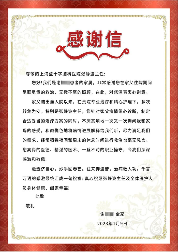 “您高尚的醫(yī)德、精湛的醫(yī)術(shù)、一絲不茍的職業(yè)操守,令我們深深感激和敬佩!”近日,上海藍(lán)十字腦科醫(yī)院神經(jīng)內(nèi)科7A病區(qū)張靜波主任收到一封設(shè)計精美、情真意切的感謝信,患者家屬向她表達了真摯感謝,讓她倍感欣慰。