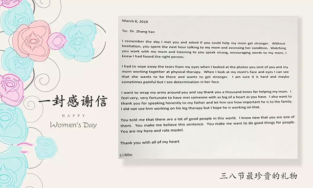 這是一封來自美國的感謝信,更是一封感情真摯讀后讓人為之動(dòng)容的感謝信,當(dāng)天正值三八婦女節(jié),也是主管技師張雁收到過的最珍貴的三八節(jié)禮物了。張雁對(duì)此說道:“作為藍(lán)十字康復(fù)科的主管技師,想患者所想,急患者所急,這是我們醫(yī)護(hù)工作者應(yīng)盡的義務(wù)和責(zé)任,能得到患者和家屬的肯定與信任,是我們最大的成就和動(dòng)力”。