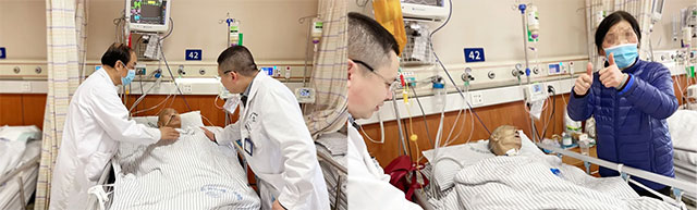 看到前來查房的潘仁龍主任和吳治群博士,郭女士豎起了兩個大拇指,并感激道:“你們于危難中將我老伴從‘鬼門關’上救了回來,我和家人都萬分感激,我要為你們豎起兩個大拇指,而不是一個大拇指!”郭女士一再強調是兩個大拇,這自有其中的緣由——
