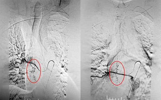 為了定位病灶,3月16日下午1點(diǎn),在復(fù)合手術(shù)室,張琪博士在劉春醫(yī)生、周林華醫(yī)生協(xié)助下通過股動(dòng)脈穿刺術(shù)將造影劑推入各個(gè)脊髓間動(dòng)脈。需要一條動(dòng)脈一條動(dòng)脈的試,并且脊髓間動(dòng)脈復(fù)雜,需要非常細(xì)致的手法,十分考驗(yàn)醫(yī)生的細(xì)心與耐心。經(jīng)過兩個(gè)多小時(shí)的連續(xù)造影,終于在T8右側(cè)肋間動(dòng)脈發(fā)現(xiàn)瘺口。“造影提示,該處瘺口由肋間動(dòng)脈供血至硬脊膜靜脈,脊髓引流靜脈迂曲擴(kuò)張明顯。”張琪博士解釋道。