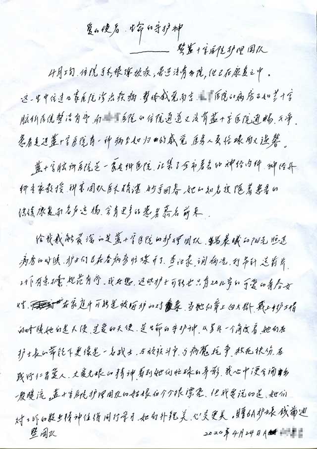 在出院前,患者親筆寫下題為《愛的使者 生命的守護(hù)神》的感謝信,高度評價(jià)醫(yī)院神經(jīng)外科(功能神外)6A病區(qū)以沈建康教授領(lǐng)銜的醫(yī)生團(tuán)隊(duì)的技術(shù)實(shí)力,還特別感激護(hù)士們提供的優(yōu)質(zhì)護(hù)理服務(wù)。