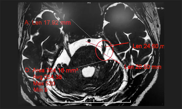行三叉神經(jīng)磁共振斷層血管成像(MRTA)檢查后,提示患者左側(cè)三叉神經(jīng)與周圍小血管關(guān)系密切。