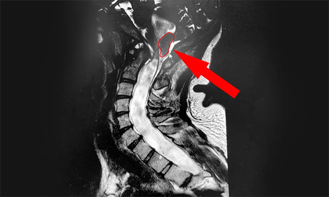侯增欣主任耐心詢問了患者病史,并開展了有針對(duì)性的檢查。小潘的頸椎核磁檢查報(bào)告很快出來了,從影像上看,患者的頸6/7椎間盤確實(shí)稍有突出,但程度并不嚴(yán)重。而導(dǎo)致患者癥狀不斷加重的“元兇”同時(shí)現(xiàn)形:小腦扁桃體延長成楔形進(jìn)入了枕骨大孔及頸椎管,頸髓受壓水腫改變,頸髓及上端胸髓內(nèi)見條狀異常信號(hào),提示為“Chiari畸形伴脊髓空洞癥”。