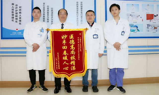 看到又逃過一劫并恢復意識的老伴,曹先生感動不已,將寫著“醫(yī)德高尚技精湛,妙手回春暖人心”字樣的錦旗,親自送到潘仁龍主任與吳治群博士辦公室。