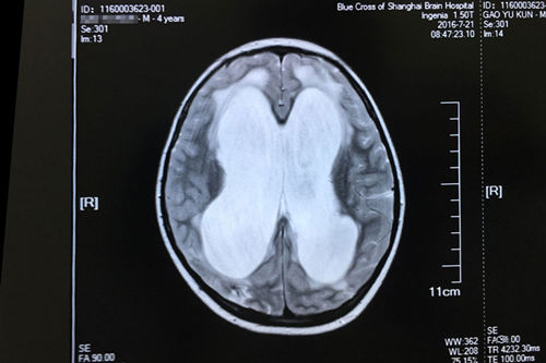 亮亮術(shù)前的磁共振影像顯示:重度腦積水伴間質(zhì)性腦水腫