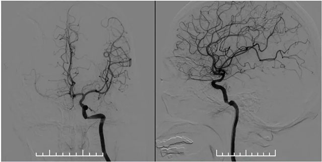 ▲ 左側(cè)頸內(nèi)動脈造影見巖骨段遠端狹窄,右側(cè)大腦中動脈由左側(cè)頸內(nèi)部分代償